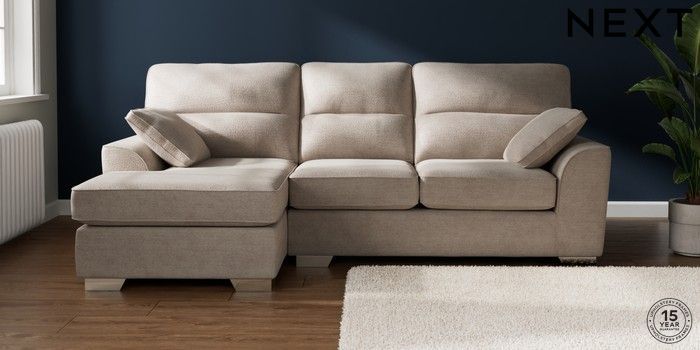 7.2.10 Buy Stamford Highback Medium Sofa Chaise - Left Hand Boucle Chenille Light Natural Large Square Angle - Chrome Metal from the Next UK online shop Click here to use our accessible website