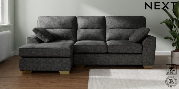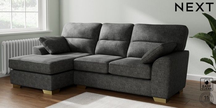 7.2.10 Buy Stamford Highback Medium Sofa Chaise - Left Hand Boucle Weave Easy Clean Charcoal Grey Large Square Angle - Brushed Brass from the Next UK online shop Click here to use our accessible website
