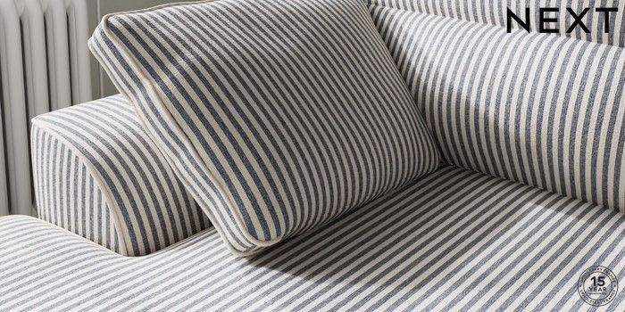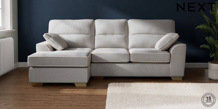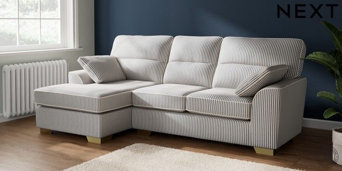 7.3.1 Buy Stamford Highback Medium Sofa Chaise - Left Hand Chenille Stripe Slate Blue Large Square Angle - Brushed Brass from the Next UK online shop Click here to use our accessible website