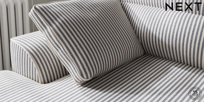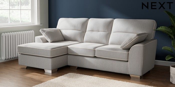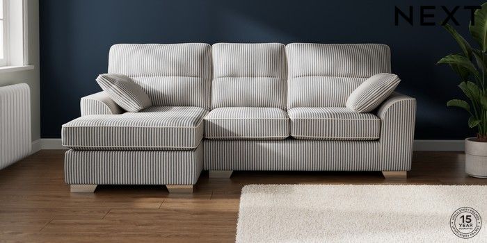 7.3.1 Buy Stamford Highback Medium Sofa Chaise - Left Hand Chenille Stripe Slate Blue Large Square Angle - Chrome Metal from the Next UK online shop Click here to use our accessible website
