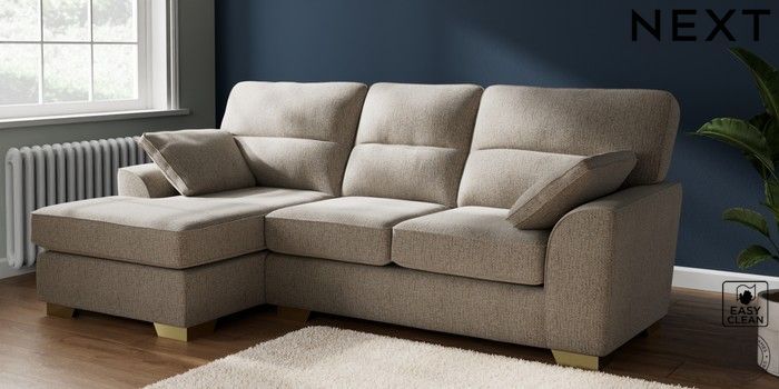 7.2.10 Buy Stamford Highback Medium Sofa Chaise - Left Hand Chunky Boucle Easy Clean Dove Large Square Angle - Brushed Brass from the Next UK online shop Click here to use our accessible website