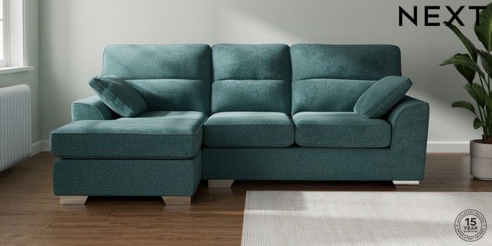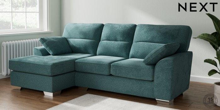 7.2.10 Buy Stamford Highback Medium Sofa Chaise - Left Hand Chunky Chenille Mid Teal Green Large Square Angle - Chrome Metal from the Next UK online shop Click here to use our accessible website