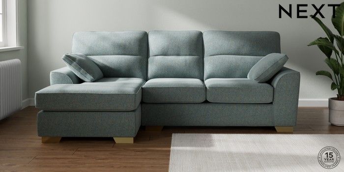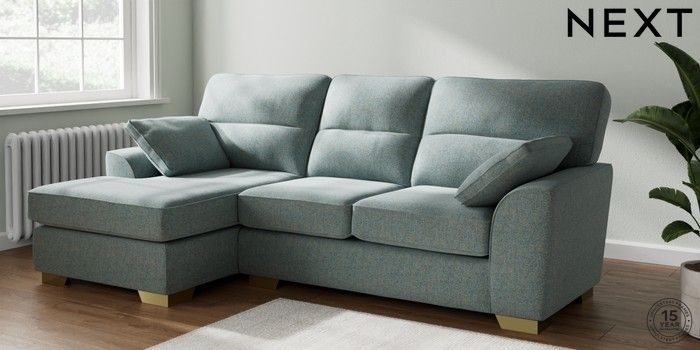 7.2.10 Buy Stamford Highback Medium Sofa Chaise - Left Hand Chunky Marl Mid Blue Large Square Angle - Brushed Brass from the Next UK online shop Click here to use our accessible website