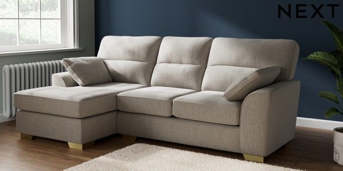 7.2.10 Buy Stamford Highback Medium Sofa Chaise - Left Hand Chunky Weave Dove Grey Large Square Angle - Brushed Brass from the Next UK online shop Click here to use our accessible website
