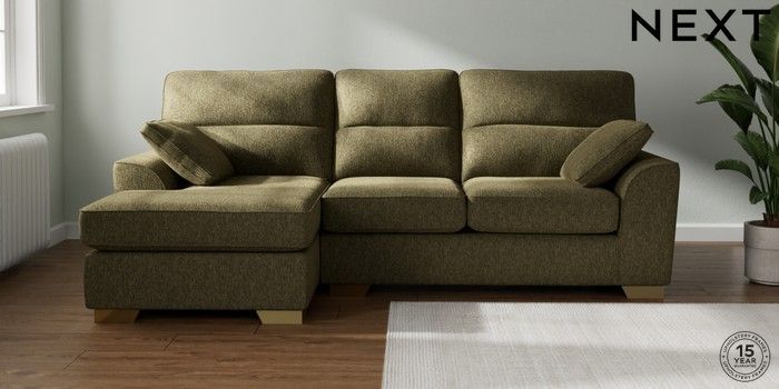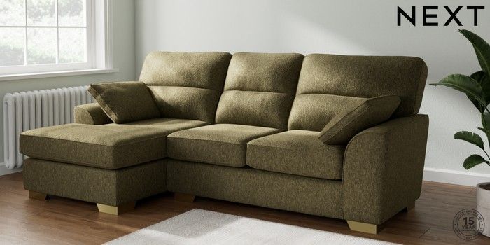 7.2.10 Buy Stamford Highback Medium Sofa Chaise - Left Hand Cotswold Chenille Dark Green Large Square Angle - Brushed Brass from the Next UK online shop Click here to use our accessible website