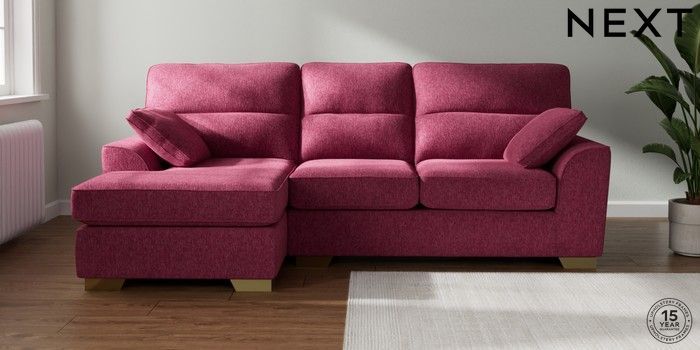 7.2.10 Buy Stamford Highback Medium Sofa Chaise - Left Hand Cotswold Chenille Dark Raspberry Pink Large Square Angle - Brushed Brass from the Next UK online shop Click here to use our accessible website