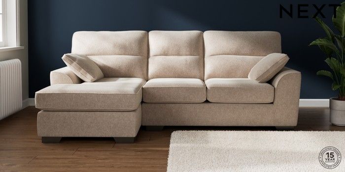 7.2.10 Buy Stamford Highback Medium Sofa Chaise - Left Hand Cotswold Chenille Light Natural Large Square Angle - Gunmetal from the Next UK online shop Click here to use our accessible website