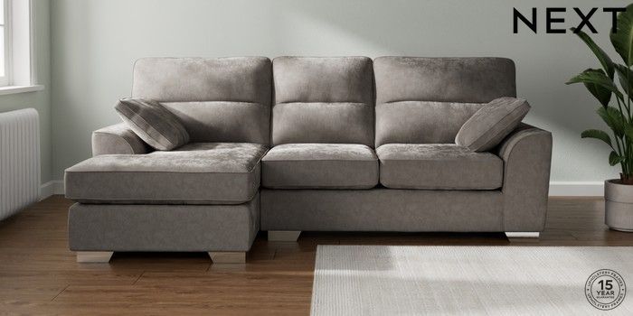 7.2.10 Buy Stamford Highback Medium Sofa Chaise - Left Hand Distressed Velour French Grey Large Square Angle - Chrome Metal from the Next UK online shop Click here to use our accessible website