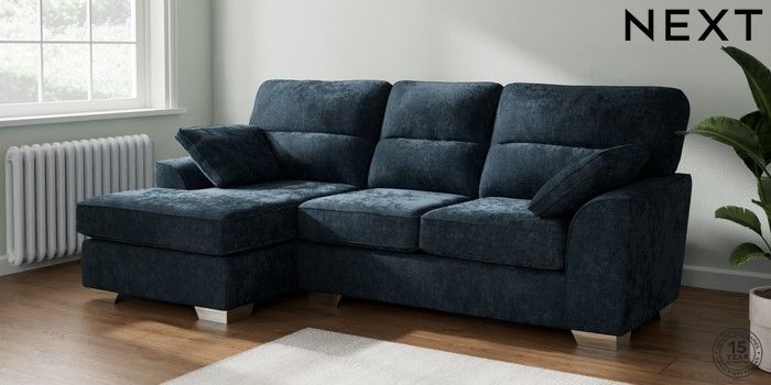 7.2.10 Buy Stamford Highback Medium Sofa Chaise - Left Hand Distressed Velour Midnight Blue Large Square Angle - Chrome Metal from the Next UK online shop Click here to use our accessible website