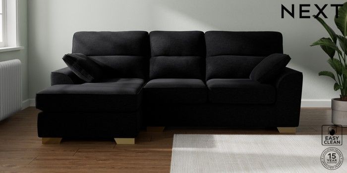 7.2.10 Buy Stamford Highback Medium Sofa Chaise - Left Hand Fine Chenille Easy Clean Black Large Square Angle - Brushed Brass from the Next UK online shop Click here to use our accessible website