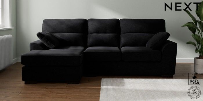 7.2.10 Buy Stamford Highback Medium Sofa Chaise - Left Hand Fine Chenille Easy Clean Black Large Square Angle - Dark from the Next UK online shop Click here to use our accessible website