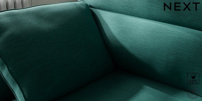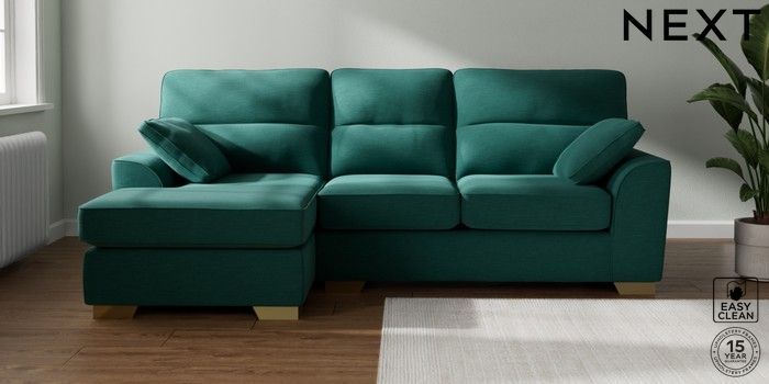 7.2.10 Buy Stamford Highback Medium Sofa Chaise - Left Hand Fine Chenille Easy Clean Dark Juniper Green Large Square Angle - Brushed Brass from the Next UK online shop Click here to use our accessible website
