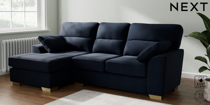 7.2.10 Buy Stamford Highback Medium Sofa Chaise - Left Hand Fine Chenille Easy Clean Dark Navy Blue Large Square Angle - Brushed Brass from the Next UK online shop Click here to use our accessible website