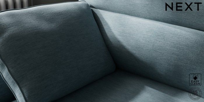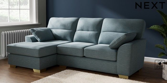 7.2.10 Buy Stamford Highback Medium Sofa Chaise - Left Hand Fine Chenille Easy Clean Mid Blue Large Square Angle - Brushed Brass from the Next UK online shop Click here to use our accessible website