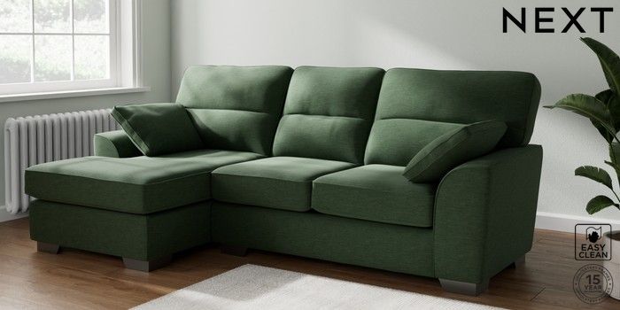 7.3.1 Buy Stamford Highback Medium Sofa Chaise - Left Hand Fine Chenille Easy Clean Mid Khaki Green Large Square Angle - Gunmetal from the Next UK online shop Click here to use our accessible website