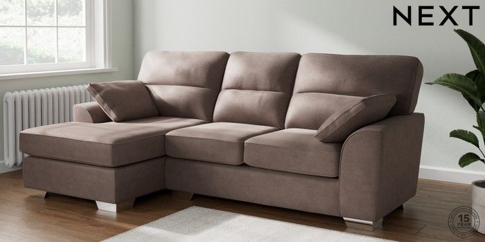 7.2.10 Buy Stamford Highback Medium Sofa Chaise - Left Hand Luxe Chenille Mink Brown Large Square Angle - Chrome Metal from the Next UK online shop Click here to use our accessible website
