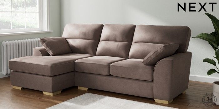 6.12.1 Buy Stamford Highback Medium Sofa Chaise - Left Hand Luxe Chenille Mink Brown Large Square Angle - Light from the Next UK online shop Click here to use our accessible website