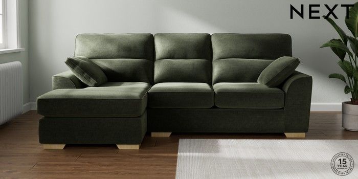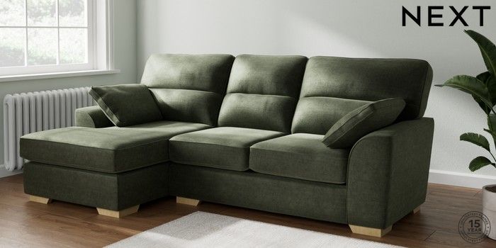 7.2.6 Buy Stamford Highback Medium Sofa Chaise - Left Hand Luxe Chenille Mid Green Large Square Angle - Light from the Next UK online shop Click here to use our accessible website