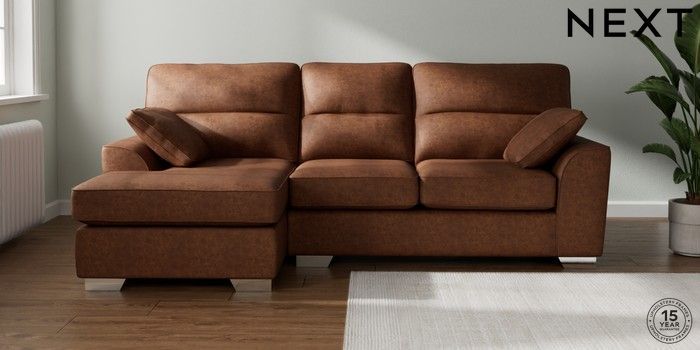 7.3.1 Buy Stamford Highback Medium Sofa Chaise - Left Hand Monza Faux Leather Easy Clean Chestnut Brown Large Square Angle - Chrome Metal from the Next UK online shop Click here to use our accessible website