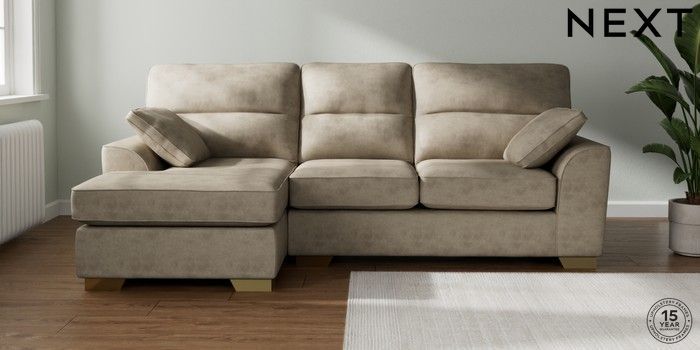 7.3.1 Buy Stamford Highback Medium Sofa Chaise - Left Hand Monza Faux Leather Easy Clean Mink Brown Large Square Angle - Brushed Brass from the Next UK online shop Click here to use our accessible website