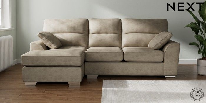 7.3.1 Buy Stamford Highback Medium Sofa Chaise - Left Hand Monza Faux Leather Easy Clean Mink Brown Large Square Angle - Chrome Metal from the Next UK online shop Click here to use our accessible website