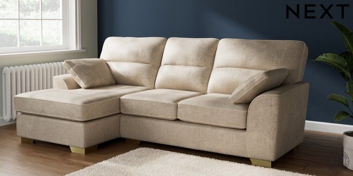 6.12.1 Buy Stamford Highback Medium Sofa Chaise - Left Hand Plush Chenille Light Natural Large Square Angle - Brushed Brass from the Next UK online shop Click here to use our accessible website