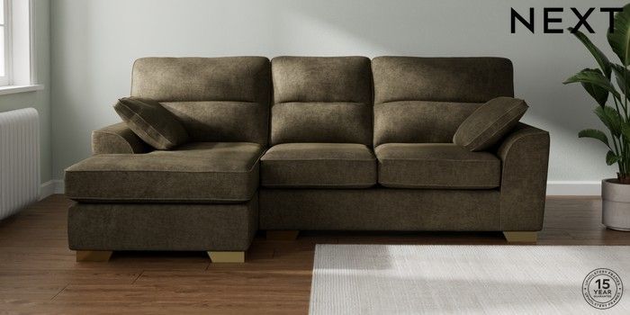 7.2.10 Buy Stamford Highback Medium Sofa Chaise - Left Hand Plush Chenille Moss Green Large Square Angle - Brushed Brass from the Next UK online shop Click here to use our accessible website