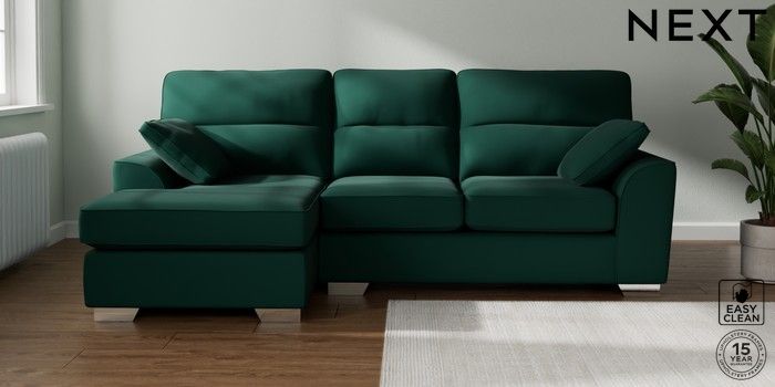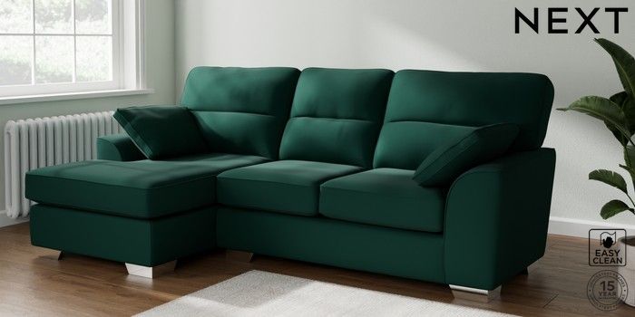 7.2.10 Buy Stamford Highback Medium Sofa Chaise - Left Hand Plush Velvet Easy Clean Bottle Green Large Square Angle - Chrome Metal from the Next UK online shop Click here to use our accessible website