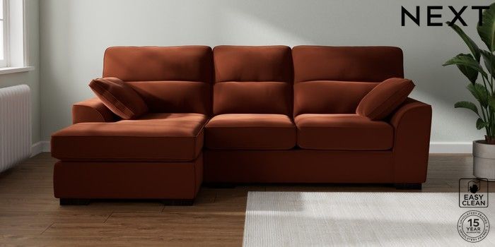 7.2.10 Buy Stamford Highback Medium Sofa Chaise - Left Hand Plush Velvet Easy Clean Ginger Orange Large Square Angle - Dark from the Next UK online shop Click here to use our accessible website