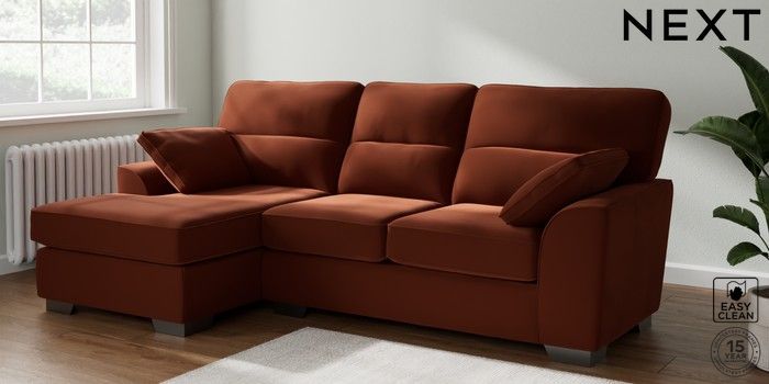 7.3.1 Buy Stamford Highback Medium Sofa Chaise - Left Hand Plush Velvet Easy Clean Ginger Orange Large Square Angle - Gunmetal from the Next UK online shop Click here to use our accessible website
