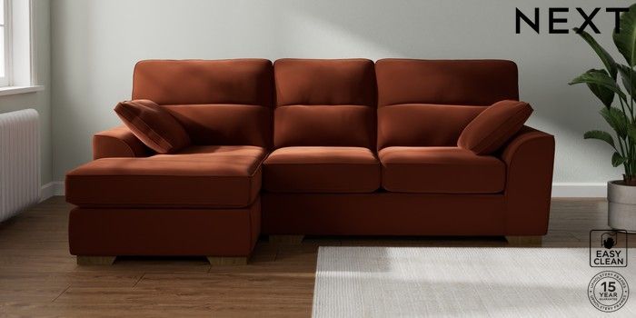 7.2.10 Buy Stamford Highback Medium Sofa Chaise - Left Hand Plush Velvet Easy Clean Ginger Orange Large Square Angle - Mid from the Next UK online shop Click here to use our accessible website