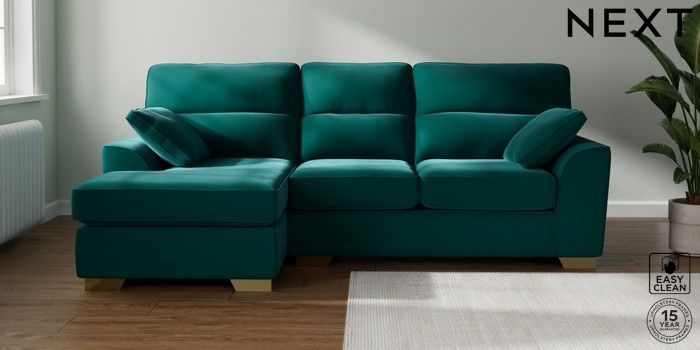 7.2.10 Buy Stamford Highback Medium Sofa Chaise - Left Hand Plush Velvet Easy Clean Juniper Green Large Square Angle - Brushed Brass from the Next UK online shop Click here to use our accessible website