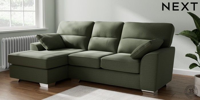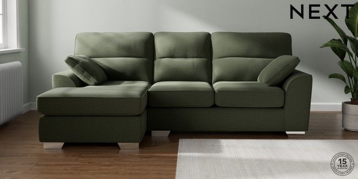 7.3.1 Buy Stamford Highback Medium Sofa Chaise - Left Hand Relaxed Linen Look Dark Green Large Square Angle - Chrome Metal from the Next UK online shop Click here to use our accessible website