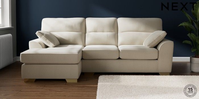 7.2.10 Buy Stamford Highback Medium Sofa Chaise - Left Hand Relaxed Linen Look Oyster Large Square Angle - Brushed Brass from the Next UK online shop Click here to use our accessible website