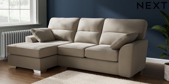 7.2.10 Buy Stamford Highback Medium Sofa Chaise - Left Hand Ripple Chenille Light Natural Large Square Angle - Chrome Metal from the Next UK online shop Click here to use our accessible website