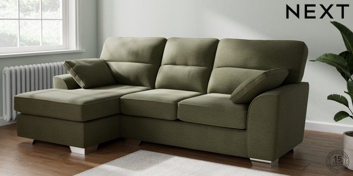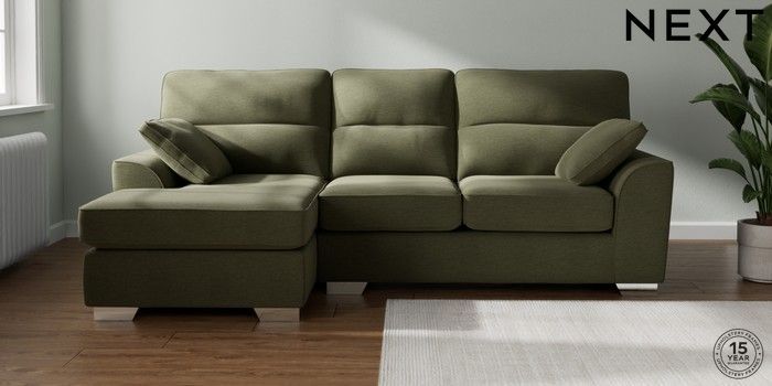 7.2.10 Buy Stamford Highback Medium Sofa Chaise - Left Hand Ripple Chenille Mid Moss Green Large Square Angle - Chrome Metal from the Next UK online shop Click here to use our accessible website