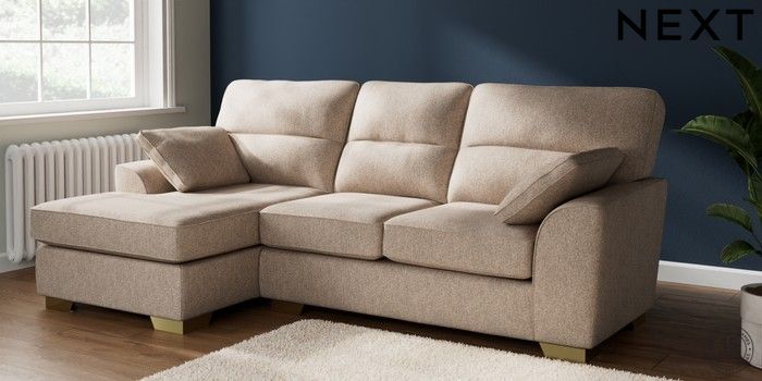 7.2.10 Buy Stamford Highback Medium Sofa Chaise - Left Hand Tweedy Chenille Mid Natural Large Square Angle - Brushed Brass from the Next UK online shop Click here to use our accessible website