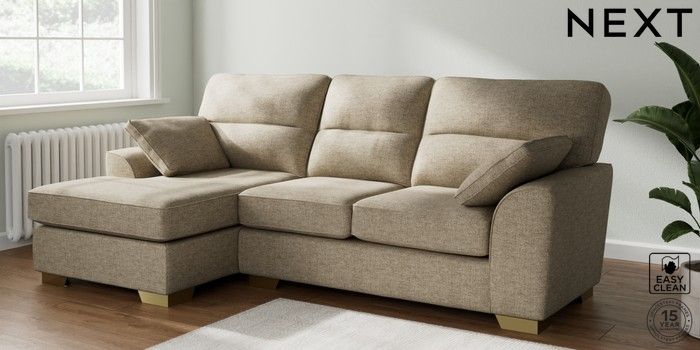 7.2.10 Buy Stamford Highback Medium Sofa Chaise - Left Hand Woven Chenille Easy Clean Mid Natural Large Square Angle - Brushed Brass from the Next UK online shop Click here to use our accessible website