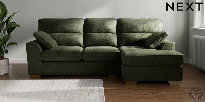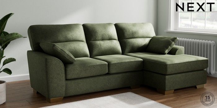 7.2.10 Buy Stamford Highback Medium Sofa Chaise - Right Hand Boucle Chenille Dark Moss Green Large Square Angle - Brushed Brass from the Next UK online shop Click here to use our accessible website