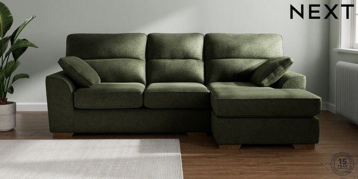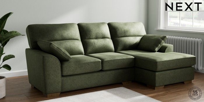 7.2.10 Buy Stamford Highback Medium Sofa Chaise - Right Hand Boucle Chenille Dark Moss Green Large Square Angle - Mid from the Next UK online shop Click here to use our accessible website