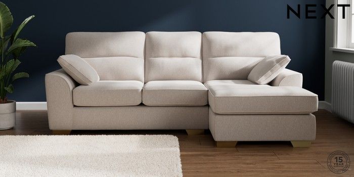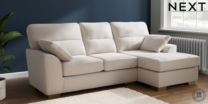 7.2.10 Buy Stamford Highback Medium Sofa Chaise - Right Hand Cotswold Chenille Oyster Large Square Angle - Brushed Brass from the Next UK online shop Click here to use our accessible website