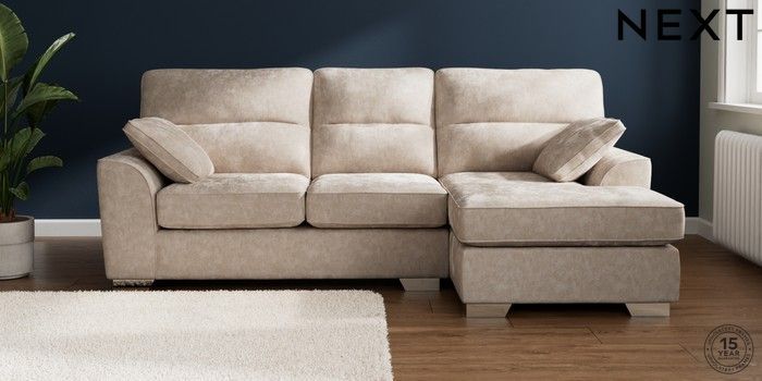 7.2.10 Buy Stamford Highback Medium Sofa Chaise - Right Hand Distressed Velour Mid Natural Large Square Angle - Chrome Metal from the Next UK online shop Click here to use our accessible website