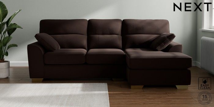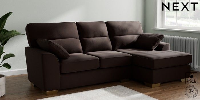 7.2.10 Buy Stamford Highback Medium Sofa Chaise - Right Hand Fine Chenille Easy Clean Chocolate Brown Large Square Angle - Brushed Brass from the Next UK online shop Click here to use our accessible website