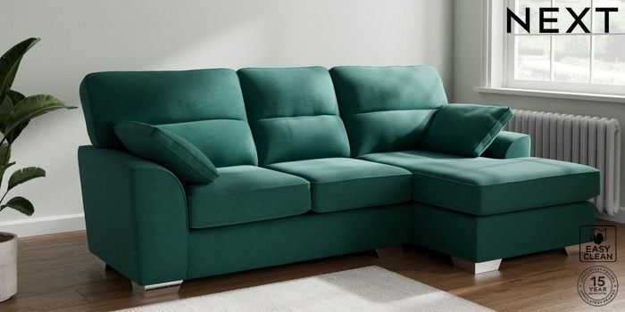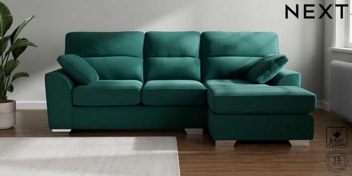 7.2.10 Buy Stamford Highback Medium Sofa Chaise - Right Hand Fine Chenille Easy Clean Dark Juniper Green Large Square Angle - Chrome Metal from the Next UK online shop Click here to use our accessible website