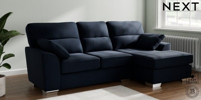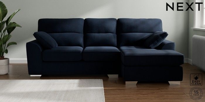 7.2.10 Buy Stamford Highback Medium Sofa Chaise - Right Hand Fine Chenille Easy Clean Dark Navy Blue Large Square Angle - Chrome Metal from the Next UK online shop Click here to use our accessible website
