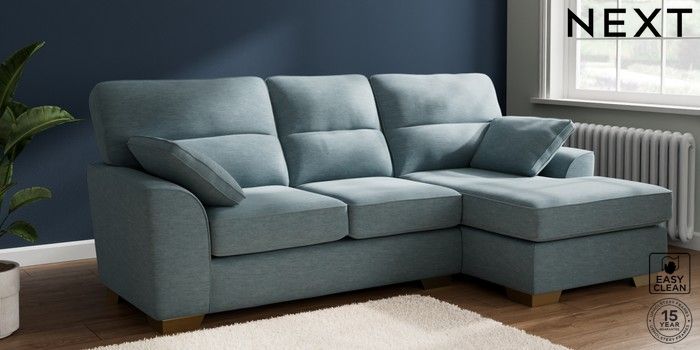 7.2.10 Buy Stamford Highback Medium Sofa Chaise - Right Hand Fine Chenille Easy Clean Mid Blue Large Square Angle - Brushed Brass from the Next UK online shop Click here to use our accessible website