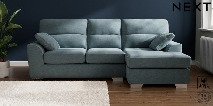 7.2.10 Buy Stamford Highback Medium Sofa Chaise - Right Hand Fine Chenille Easy Clean Mid Blue Large Square Angle - Chrome Metal from the Next UK online shop Click here to use our accessible website