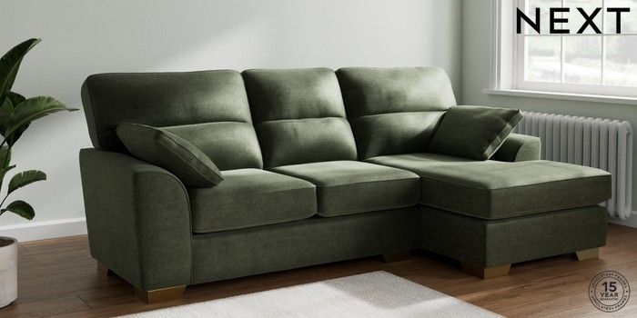 6.12.1 Buy Stamford Highback Medium Sofa Chaise - Right Hand Luxe Chenille Mid Green Large Square Angle - Brushed Brass from the Next UK online shop Click here to use our accessible website