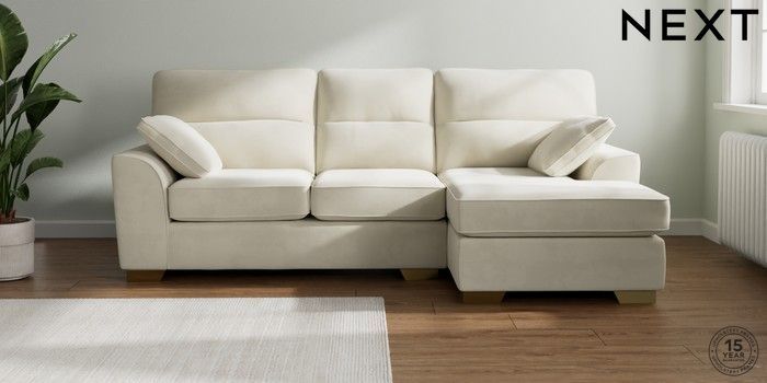 7.0.3 Buy Stamford Highback Medium Sofa Chaise - Right Hand Luxe Chenille Oyster Large Square Angle - Brushed Brass from the Next UK online shop Click here to use our accessible website
