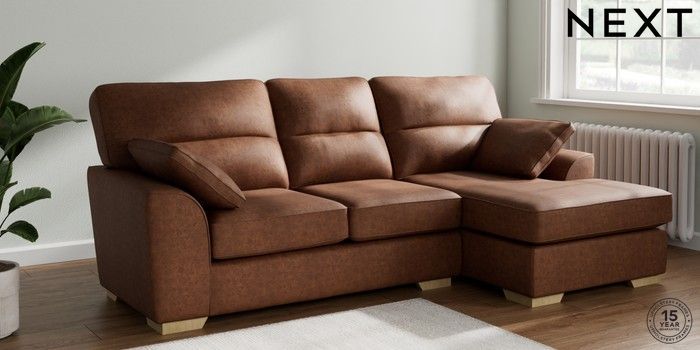 7.3.1 Buy Stamford Highback Medium Sofa Chaise - Right Hand Monza Faux Leather Easy Clean Chestnut Brown Large Square Angle - Light from the Next UK online shop Click here to use our accessible website